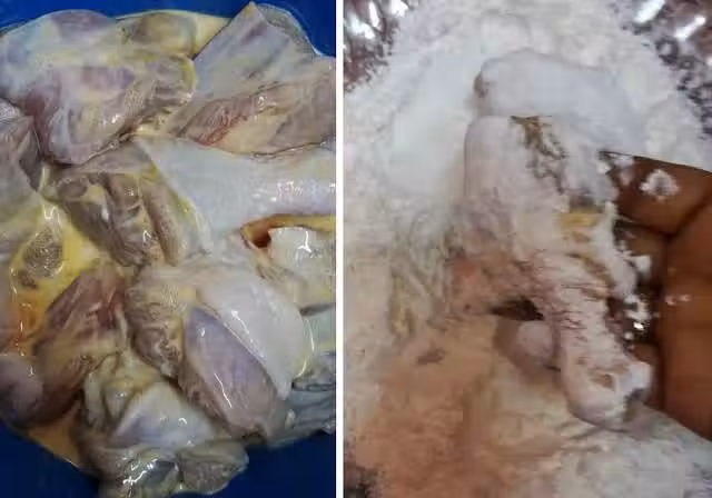 2. 腌制好後,再把雞肉放入玉米粉中,裹上一層玉米粉。