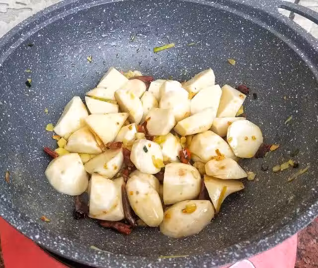 6、等到芋頭塊炒勻之後,將提前就混合好的調味料倒進去。這裡的調味料是將適量的生抽,老抽,白糖和鹽,這些調味料全部拌勻後就可以了。