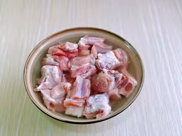 4、泡好之後的排骨再用清水沖洗乾淨,將排骨上的雜質沖洗乾淨。再用廚房紙將排骨上面的水分吸干,這樣準備工作就完成了。