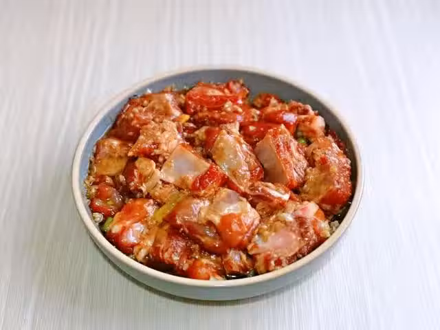 10、腌制好的排骨加澱粉抓勻,再將切好的青蒜鋪在上面。