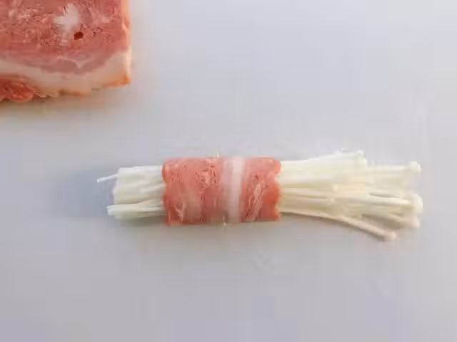 4、 把西紅柿放到熱水中去皮,然後把西紅柿切成丁,這裡可以把西紅柿丁切的小一些,碎一些,然後把蒜切成蒜沫,把所有切好的培根和金針菇一起卷好,用牙籤固定好。
