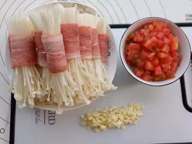 5、 在鍋里放入適量的食用油,然後把剛才固定好的培根金針菇卷整齊的鋪到鍋里,小火加熱,然後轉中火,把培根兩面都煎到稍微變色的時候就可以了。