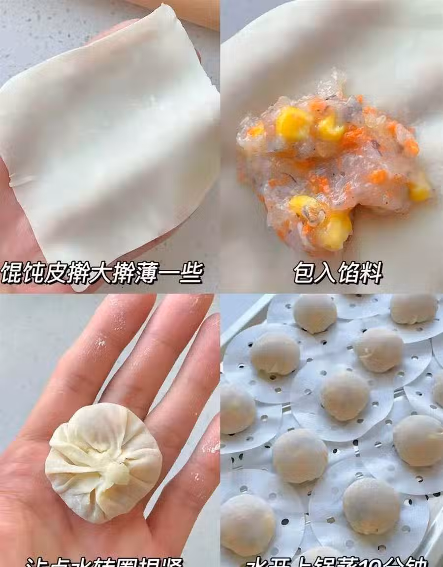 準備食材:餛飩皮,玉米粒,蝦仁,紅蘿卜。