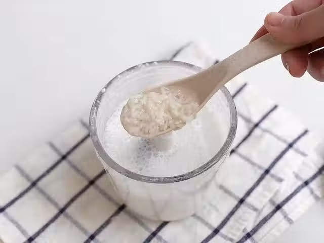 第三步:取一個碗,碗中倒入半碗溫水,加入5g酵母,用勺子不斷攪拌充分混合溶解化開。