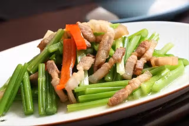 5、接下來,把薑絲倒進去,煸炒出香味以後,再將芹菜倒入其中,簡單略炒兩下,然後重新將肉絲倒入鍋中,加上適量的生抽、鹽、味精、白糖來調味,用鏟子不停翻炒,直至翻炒均勻後,將香菜撒進去,略炒幾下直至變軟,就可以盛出來開吃啦!