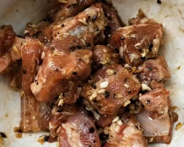 5、將剛才切好的蒜末、薑末、豆豉以及適量的胡椒粉,戴上手套,將排骨抓均勻,用保鮮膜覆蓋住碗口,放到冰箱冷藏腌制一個小時。