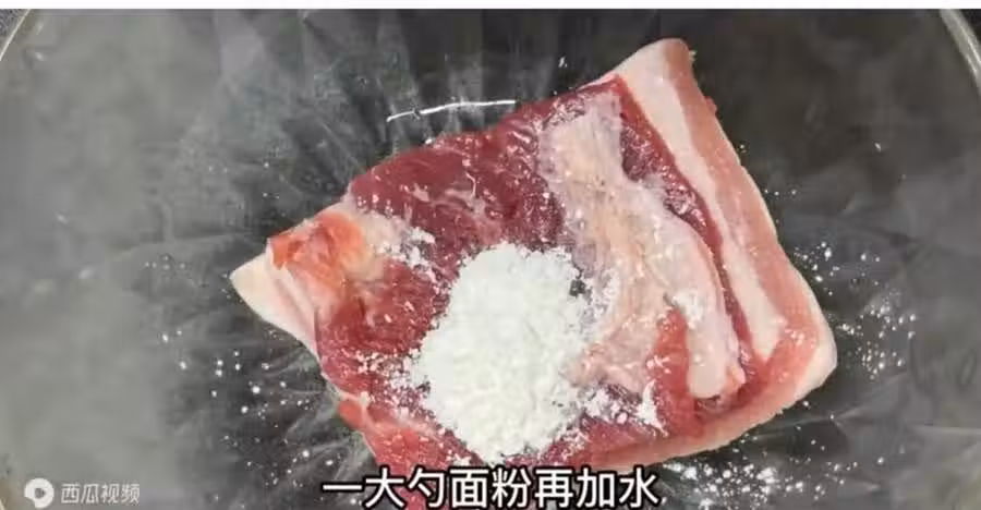 接著把臟水倒掉,換水將肉多清洗幾次。清洗肉的時候不要用涼水,用溫水來洗,可以把豬肉洗得更干凈,每一個地方都要仔細的清洗。看一下以這種方式洗出來的豬肉,晶瑩剔透的,非常干凈。