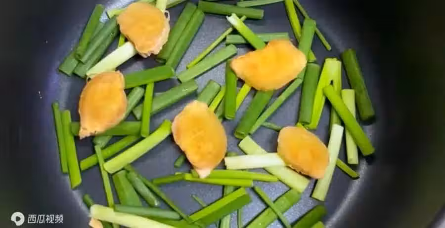 接著將生薑片也一片一片的鋪在蔥的上面。然後把剛才炒過的五花肉塊倒進來。倒進來之後,用筷子稍微擺放一下,讓肉塊均勻的平鋪在電飯鍋裡面,這樣有助於肉塊更好的受熱均勻。