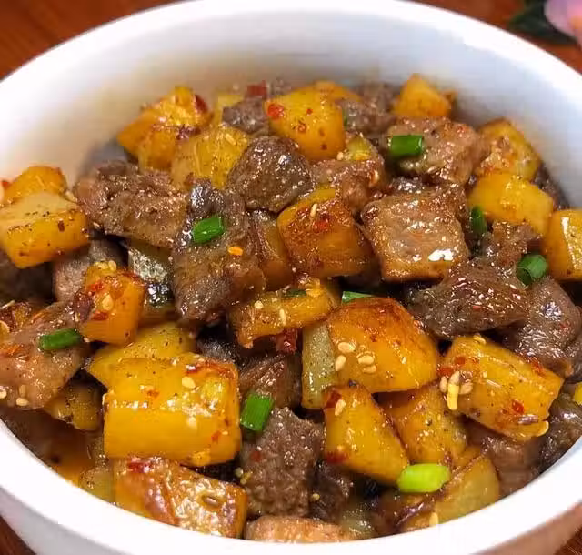 1、牛肉切均等大小丁,加一勺料酒➕二勺生抽➕一勺蚝油➕一勺澱粉➕適量胡椒粉➕一勺香油,抓勻腌制20分鐘,給牛肉入個底味。