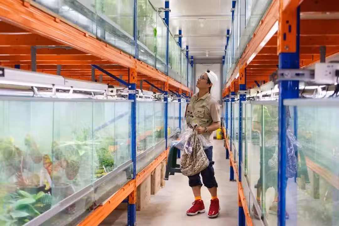 我們見到阿介的時候,他正帶著老花眼鏡在24攝氏度的恆溫冷房裡檢查植物。之前的半個月,他都待在沒有手機訊號的荒野做採集。全球熱帶植物的棲息地被嚴重破壞,阿介從森林帶回了很多瀕危植物,讓它們好好活在保種中心。