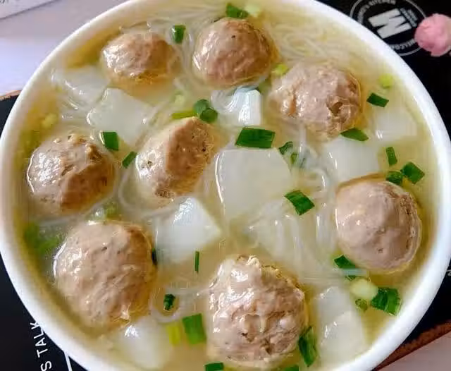 食材準備:牛肉丸,白蘿蔔,粉絲,蔥,姜,食鹽,胡椒粉,雞精,小蔥