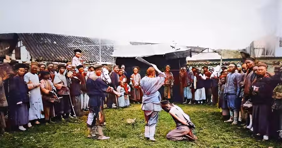 清朝時期,有嚴酷的刑法。照片中,一名罪犯雙手被縛跪在地上,劊子手高高地舉起屠刀。遠處臨時搭建的棚子下,站著兩面監斬官。法場周圍站滿了看熱鬧的人,他們面無表情。