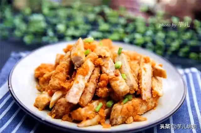 4.鍋里放入適量植物油,燒至7成熱,放入鹹蛋黃翻炒,炒至起泡。放入蒸好的芋頭條,翻炒均勻。放入適量的鹽,撒上洗凈切碎的蔥花,翻勻出鍋。