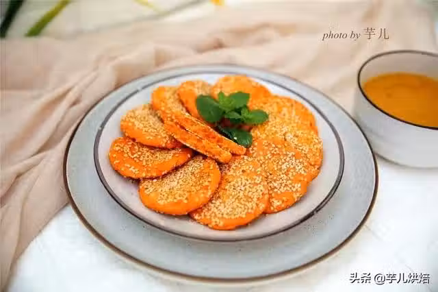 3.再將紅薯麵糰平均分成12個小麵糰。取一個在手上滾圓,壓扁,做成一個小餅。將做好的紅薯餅在芝麻碗里壓一下,讓餅兩面都均勻的沾上芝麻。