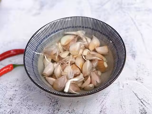 3、經過浸泡好的蒜頭,沿著蒜頭橫切面將膜輕輕撕開,簡單快速又實用,一會兒就把蒜頭剝完了。