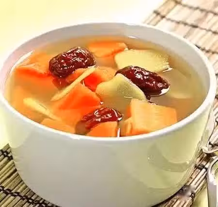 5、 湯熬制1小時後,放入生薑、紅棗、繼續熬制30分鐘,共1個半小時,最後放入冰糖略微煮一會兒,就可以食用了。