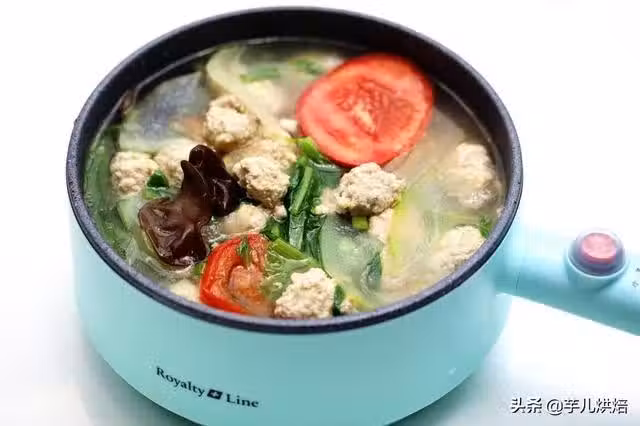 6.湯燒開,手上沾水後,手取少許肉餡,從虎口處擠出,用小勺挖下,放入湯中。