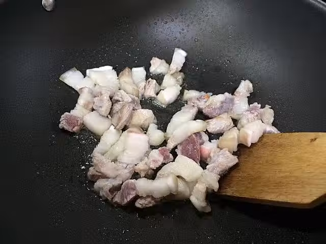 如圖中所示,略微有些焦黃色,這時候煸出來的五花肉不油膩而且咸香美味。