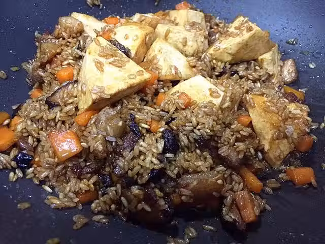 將煸炒好的食材轉移到電飯煲中,電飯煲中加入適量的水,水的量沒過米飯的1/3個手指即可,這樣燜出來的米飯軟糯香甜又能粒粒分明。