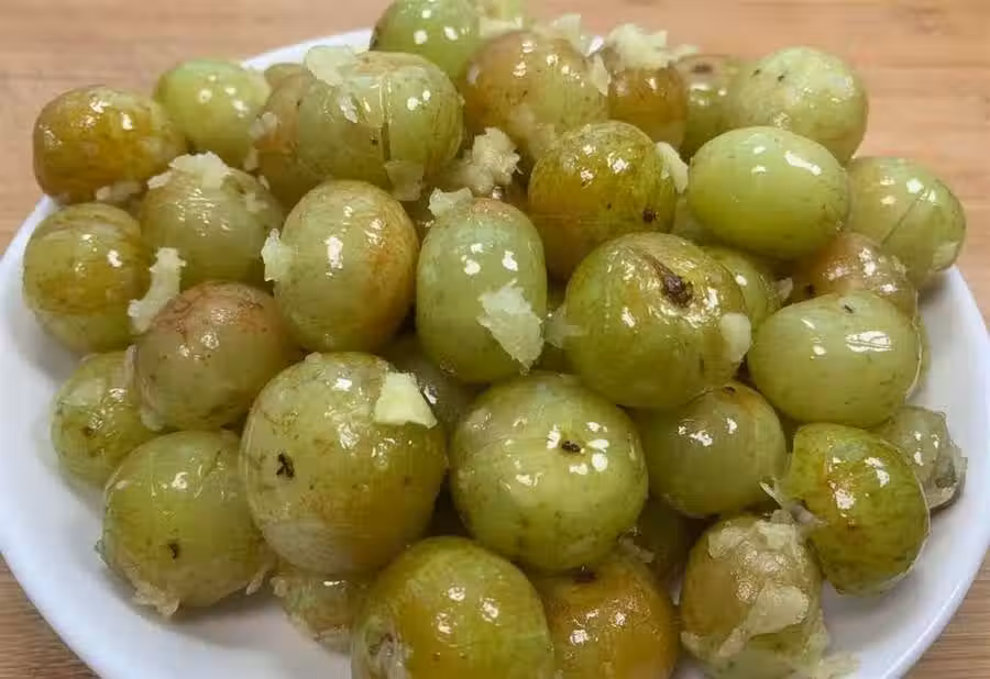取適量山姜剁碎,再準備適量鹽和白糖,把油柑果裝入無水無油的容器中,一層果子加一層鹽,糖,和山姜,把瓶子裝滿,擰緊蓋子,一般七天左右果子就變軟了,美味的腌油柑就做好了。來個特寫,是不是看著就流口水了,這可是解油膩的好食材,大魚大肉吃多了,每天吃幾顆油柑果,特別舒服。