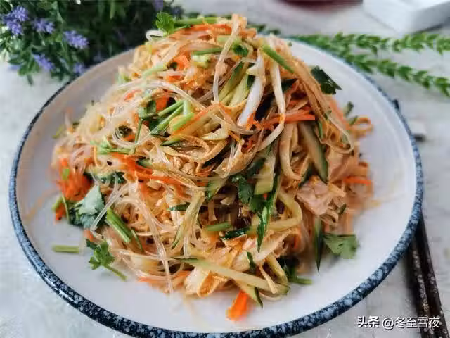 【家常涼菜】所需材料:黃瓜2根、胡蘿蔔1根、白菜心1棵、干豆腐2-3張、香菜2棵、粉絲1把、辣椒油1湯匙、香油1湯匙、大蒜3瓣、生抽2湯匙、白糖1湯匙、米醋2湯匙、