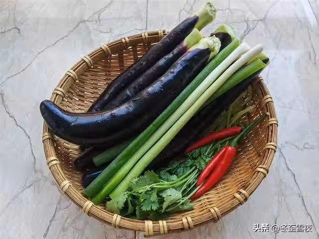 【涼拌手撕茄子】所需材料:茄子1斤、小蔥2棵、香菜2棵、小米辣3個、大蒜5瓣、生抽2湯匙、陳醋1湯匙、味精少許、