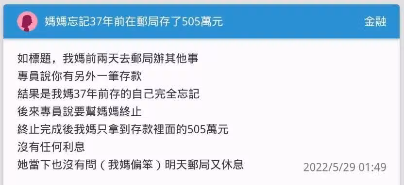 郵局存505萬!天兵媽放37年才想到「領出總金額傻眼」 急求助「這樣正常嗎」網點破盲點:沒錯啊!🤣