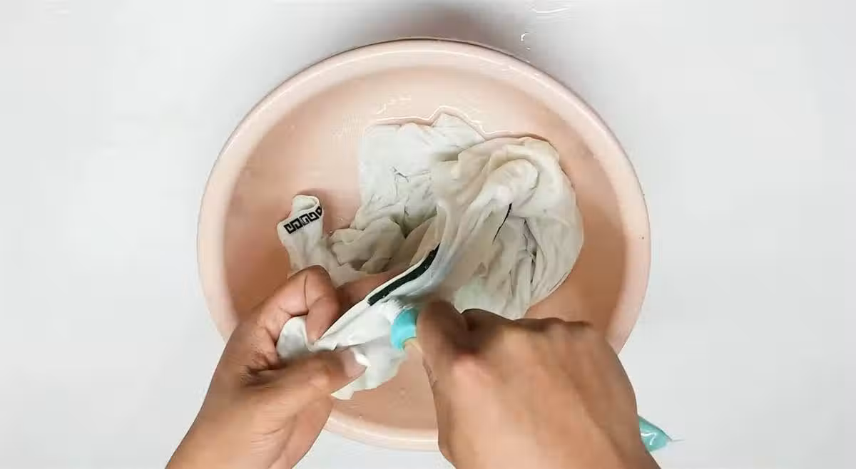 大家都知道牙膏刷牙,美白牙齒效果非常好,牙膏清洗衣服的黃漬效果也是特別棒。牙膏不光可以用來刷牙,還可以起到增白、美白的效果,可以輕鬆讓白衣服增白。我們把牙膏塗抹在領口處,塗抹完再挫試一下,讓牙膏均勻地粘在衣物上。如果說您的衣服袖口處也發黃了,也可以在袖口處擠上一點牙膏,然後塗抹均勻搓試一下,。把衣服放在盆子裡,讓它浸泡兩分鐘。