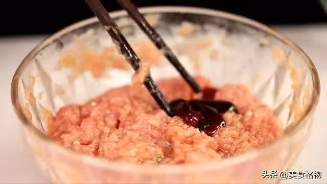 全程大概加5次水左右,每一次大概也就是50毫升,攪到肉阻力越來越大,肉之間出現粘稠拉絲,用筷子挑起一坨肉餡,它能夠成坨不往下滴落,這樣的狀態就好了。
