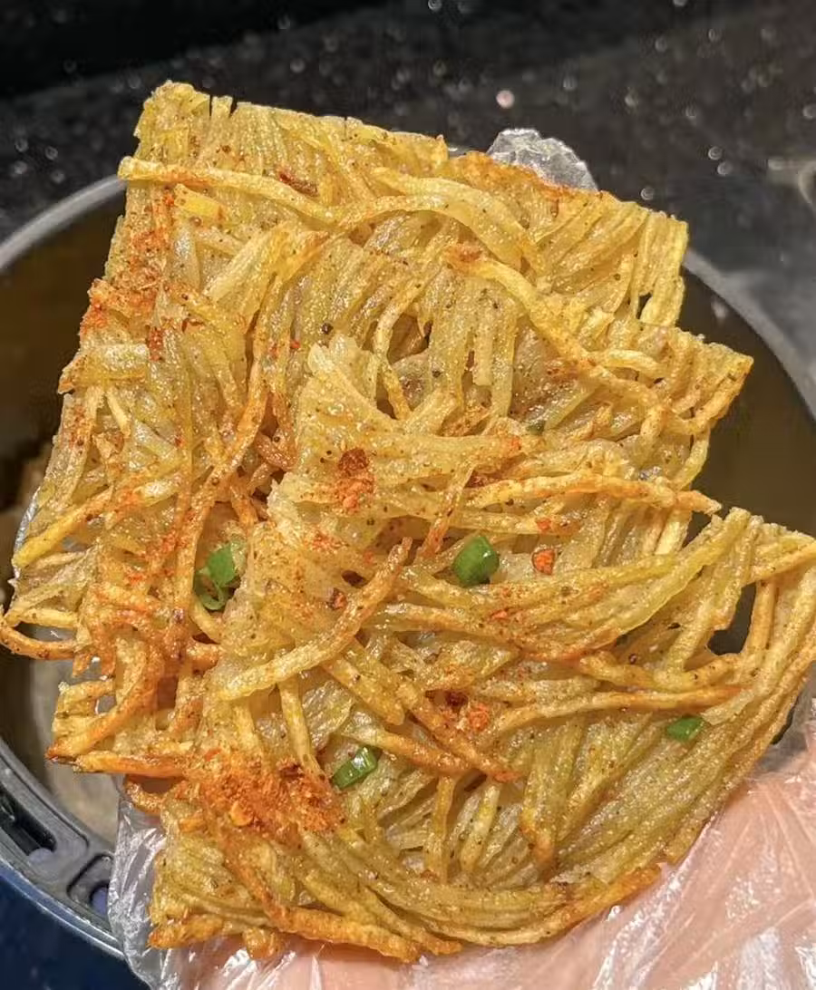 油紙刷上一層油,鋪上土豆絲,表面再噴一點油,180度烤15分鐘,中途翻面,出鍋撒上辣椒麵和蔥花!!喜歡焦香酥脆的可以多烤一下