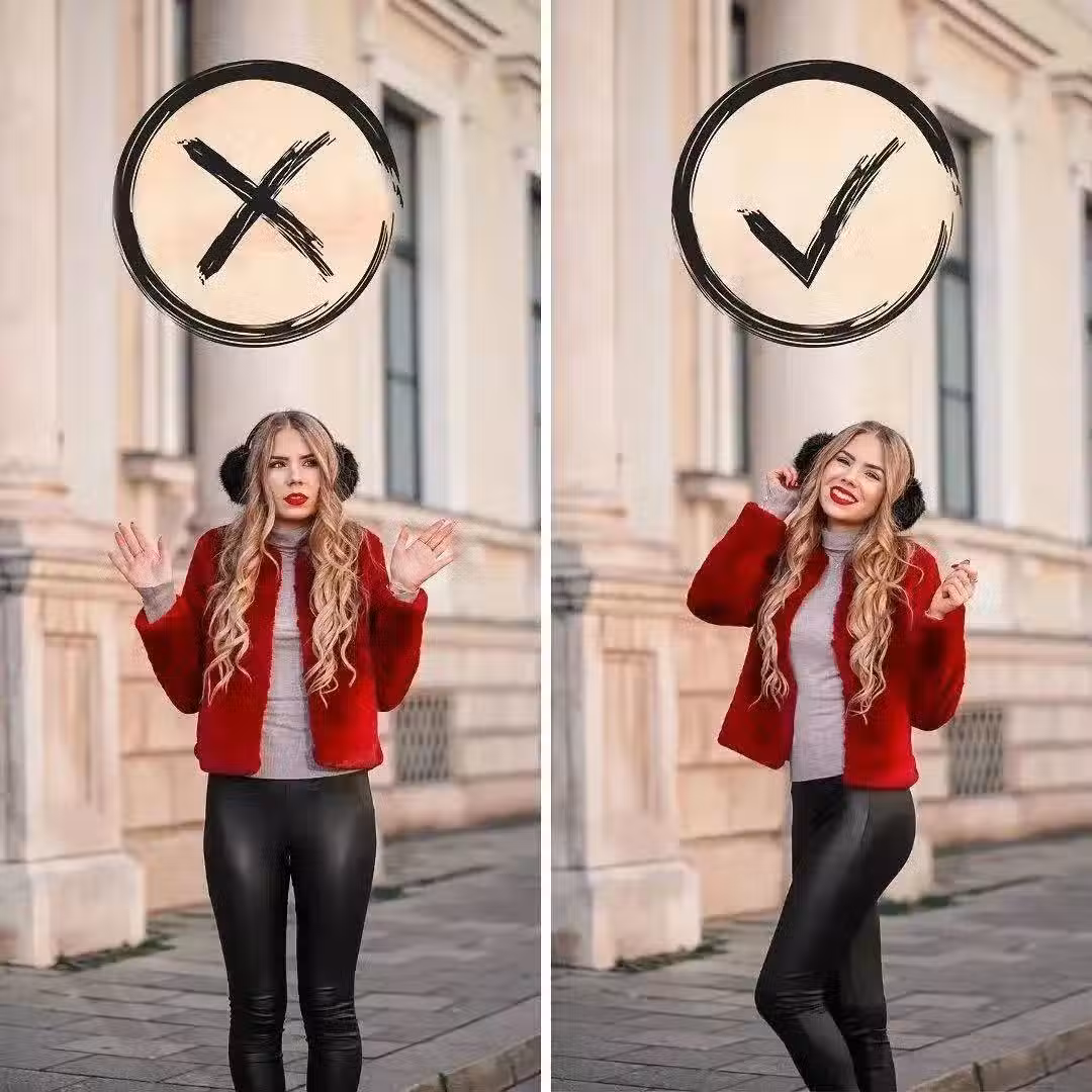 拍全身照,別讓自己的手不知道怎麼擺,像左邊那樣確實不好看,可以像右邊的女生一樣,雙手借用道具動起來,比如可以摸摸帽子,撩撩頭髮,很自然,又漂亮。