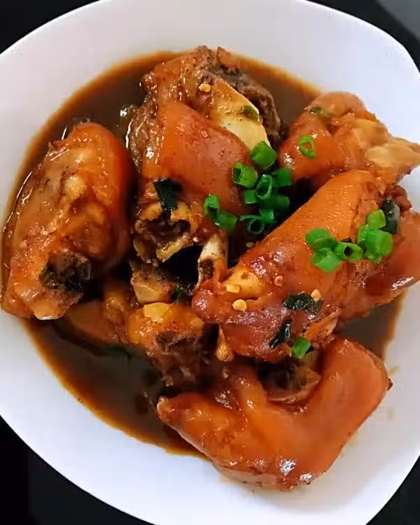 原料:豬手2隻,冰糖,油,老抽,生抽,蔥,姜,蒜,八角1個,桂皮1小塊,胡椒粉。