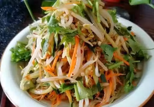 食材:綠豆芽250克、黃瓜1根、胡蘿蔔1根、香菜1棵、油鹽適量、辣椒油1湯匙、香油1湯匙、大蒜3瓣、白糖1/2湯匙、米醋2湯匙、生抽1湯匙