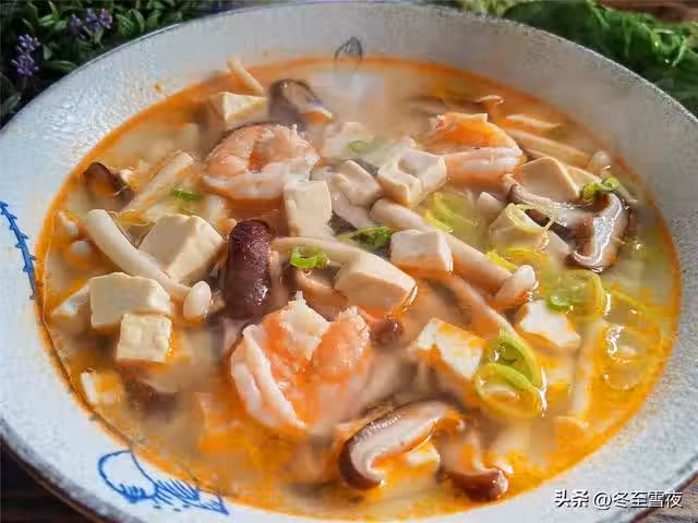 【蝦仁菌菇豆腐湯】所需材料:青蝦7-8個、海鮮菇120克、香菇5-6個、豆腐1塊、油鹽適量、蔥1段、姜2片、料酒半湯匙、白鬍椒粉1茶匙、雞精1茶匙、