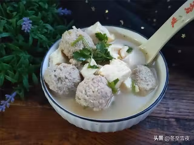 【豆腐丸子湯】所需材料:豆腐1塊、豬肉半斤、香菜1棵、蝦皮1湯匙、雞蛋1個、鹽適量、香油1湯匙、蔥1段、姜1塊、白鬍椒粉1茶匙、料酒半湯匙、