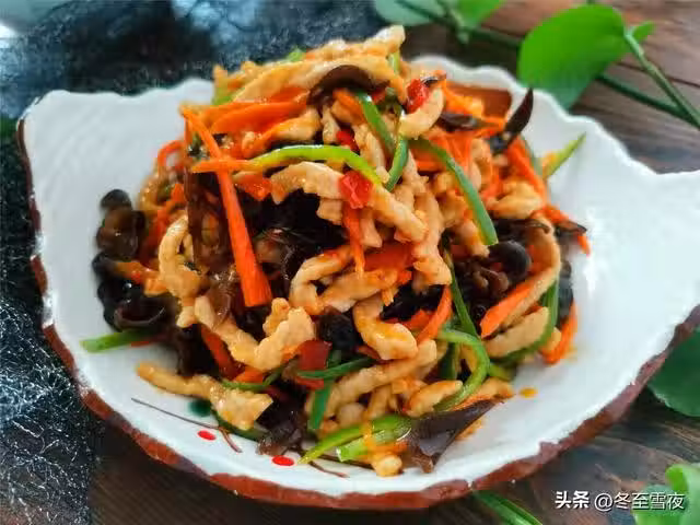【魚香肉絲】所需材料:豬裡脊肉半斤、水發木耳1小碗、胡蘿蔔半根、尖椒2個、油鹽適量、泡椒1湯匙、蔥1段、姜2片、大蒜2瓣、白糖1湯匙、澱粉1.5湯匙、米醋2湯匙、醬油2湯匙、料酒半湯匙、雞精1茶匙、
