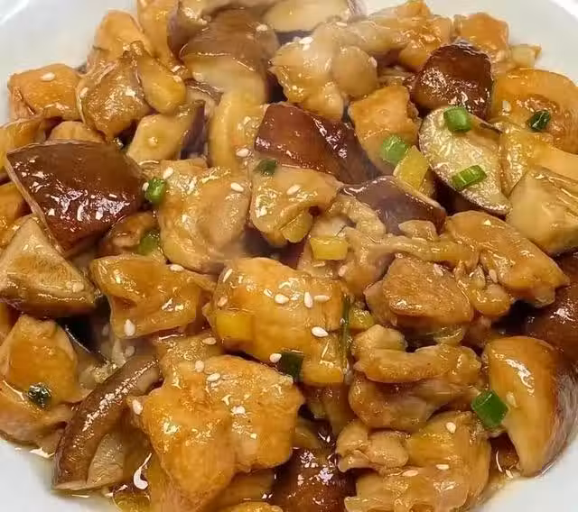 4.鍋中倒油爆香蔥姜蒜,放入香菇翻炒變軟,再加入雞塊一起翻炒入味兒後,加入白芝麻出鍋裝盤。