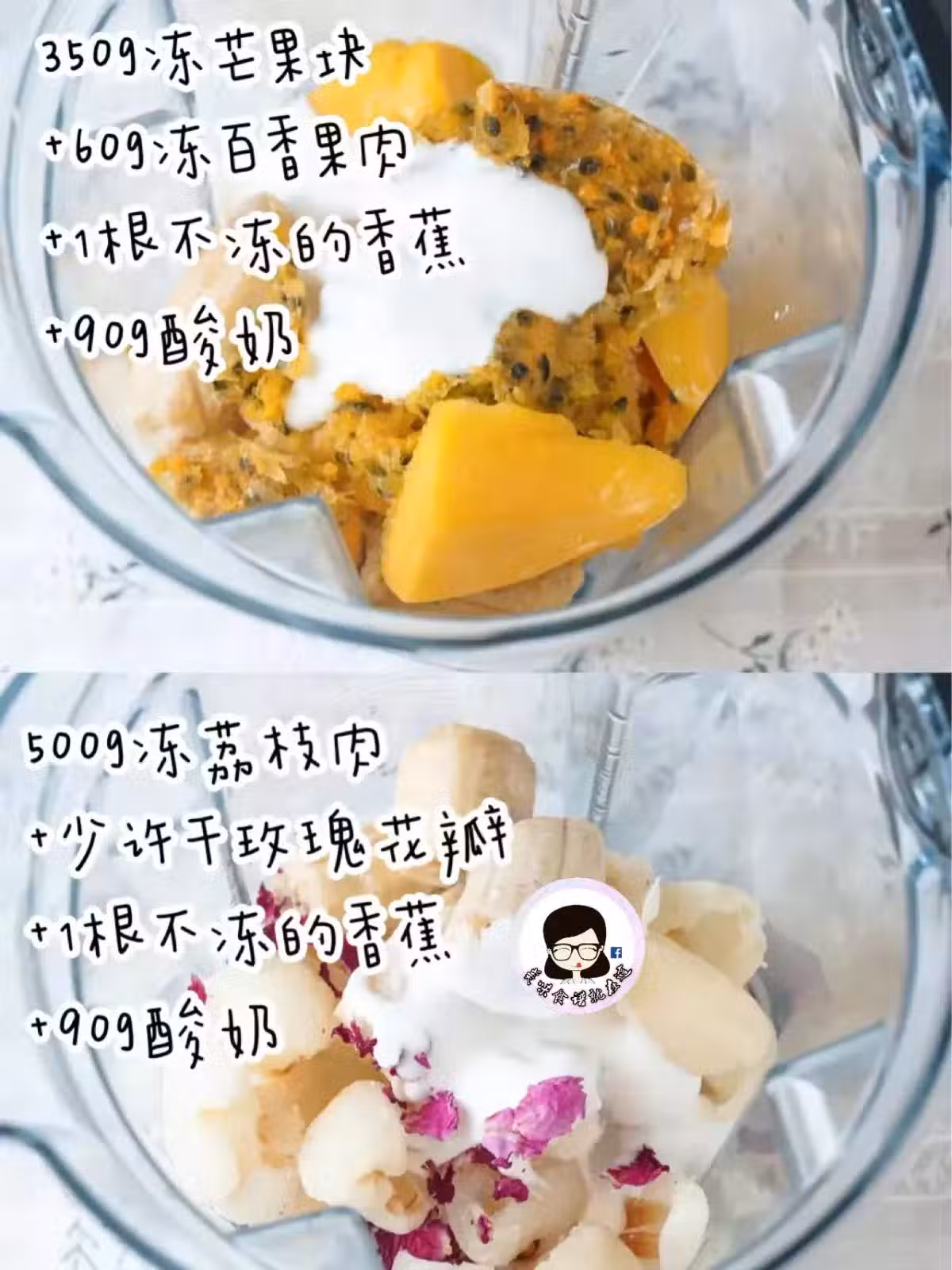 芒果口味:350g凍芒果塊(約2隻)+60g凍百香果肉(約2個)+1根不凍的香蕉+90g酸奶