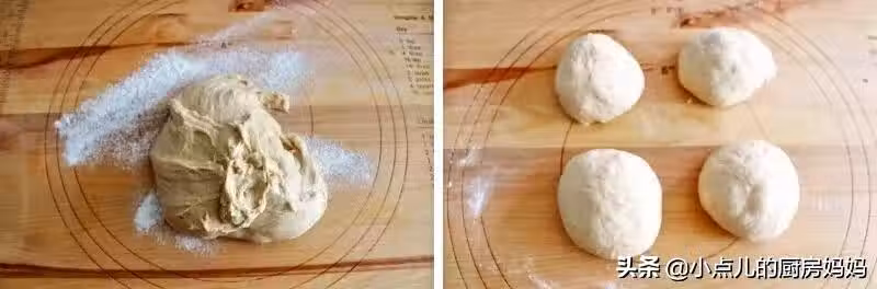 接下來,將麵糰擀成長11厘米,寬14厘米的形狀。核桃仁和葡萄乾也分成4等份。 如圖,均勻地在麵餅上鋪上核桃和葡萄乾,捲起來,然後用手捏緊封口。
