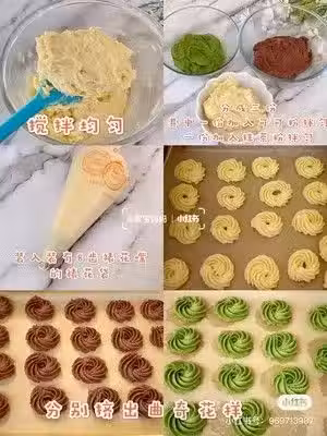 4⃣️烤箱預熱,8齒裱花嘴放入裱花袋中,裝入麵糊,擠在墊油紙的烤盤上,放入烤箱165度烤20分鐘,出爐放涼後酥脆可口