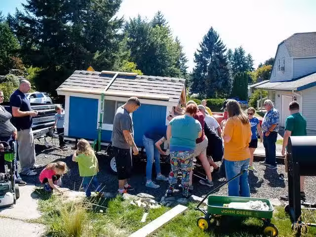 並且還有23名鎮民決定幫助海莉一起建造流浪漢小木屋。圖中是眾人將木屋放到推車上。