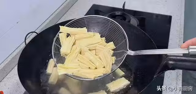 然後控掉多餘的水分,倒入冷水中過一下冷水,這樣吃起來口感更加的筋道,然後將腐竹裡邊多餘的水分捏干,也放入大盆中備用。