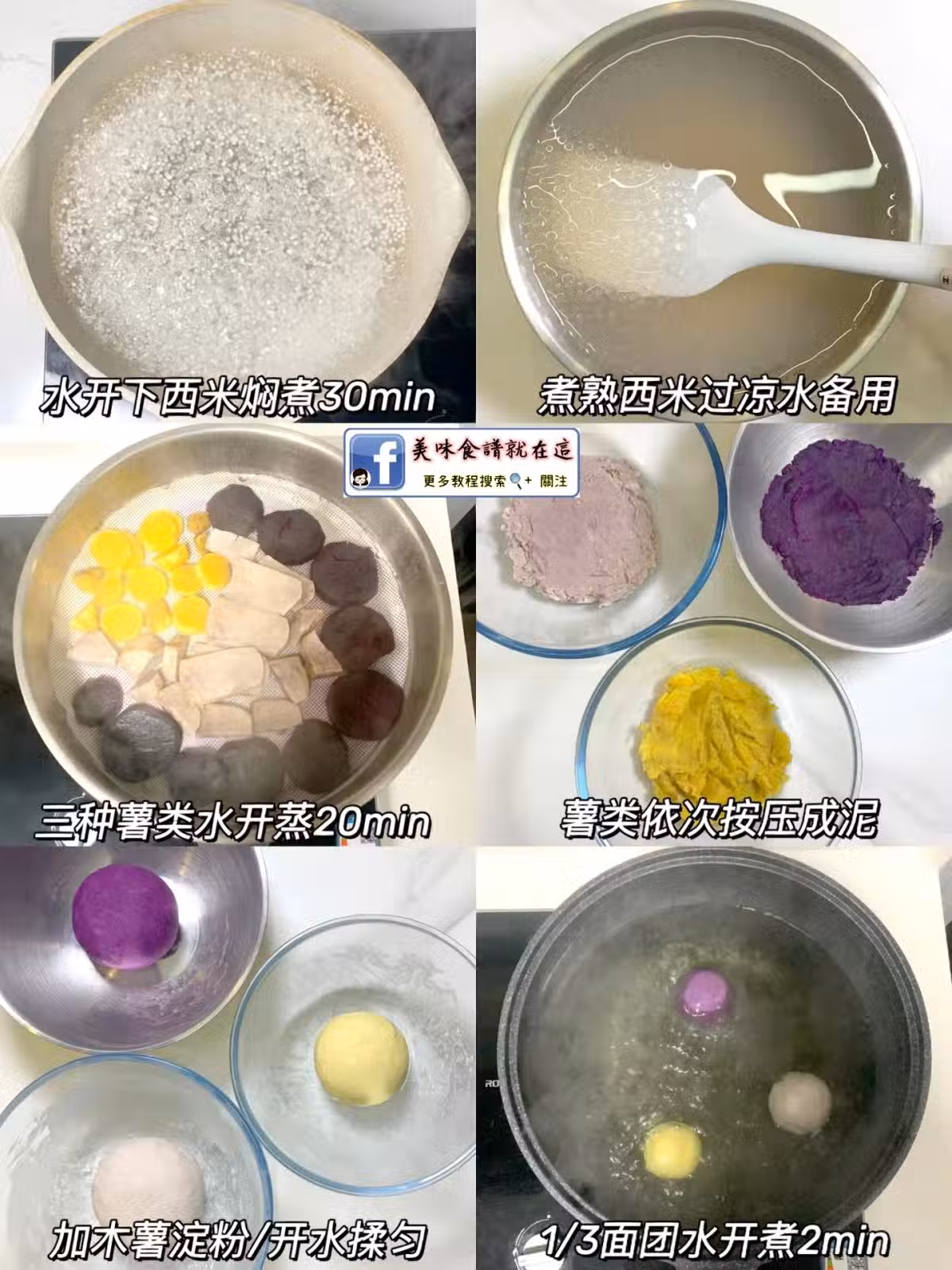 ❷將薯類切塊水開上鍋蒸20min壓成泥 木薯澱粉分成3等份依次倒入 加適量開水攪勻揉成團