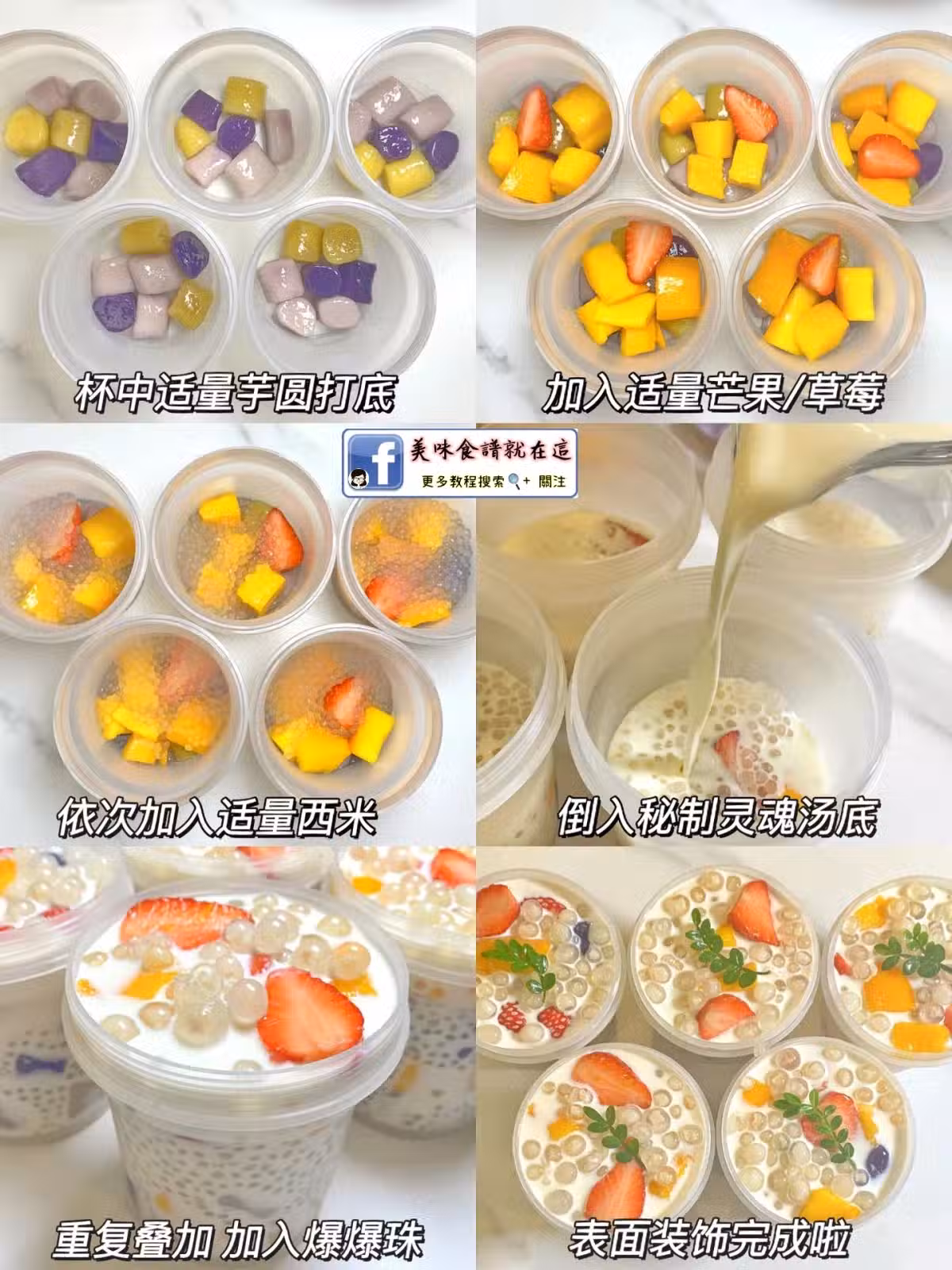 ❻組裝:杯里加入芋圓/芒果塊/西米/湯底/爆爆珠/草莓 表面裝飾下就完成啦~