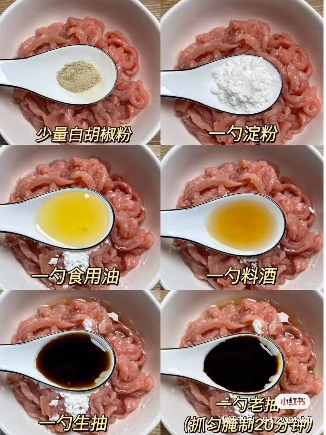 1⃣️肉絲腌制:1勺生抽➕1勺老抽 ➕1勺料酒➕1勺食用油➕1勺澱粉➕少量白鬍椒 抓勻腌制20分鐘