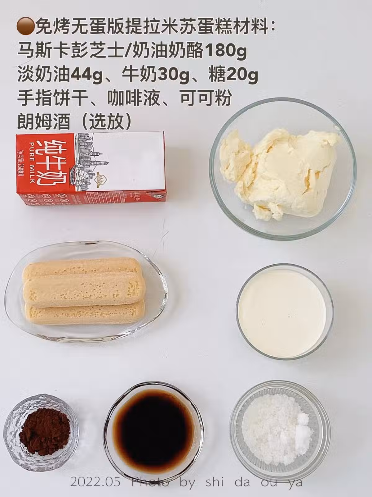 馬斯卡彭芝士/奶油奶酪180g|淡奶油44g|牛奶30g|糖20g|手指餅乾|咖啡液|可可粉|朗姆酒(選放)