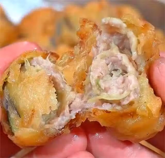 步驟四:鍋中燒油,油熱以後將卷好的茄子下鍋,炸表面金黃以後撈出即可。香酥的表皮,裡面是特別特別香的肉,吃一口特別特別的滿足。