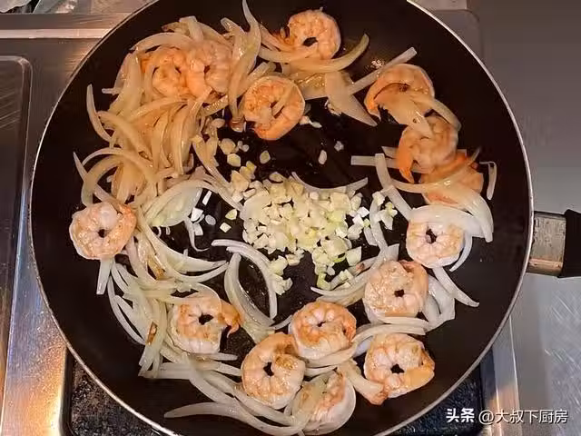 2、起油鍋下洋蔥絲炒至軟化,洋蔥撥一邊放蝦仁炒至兩面金黃約七分熟,爆香蒜末、蔥白。
