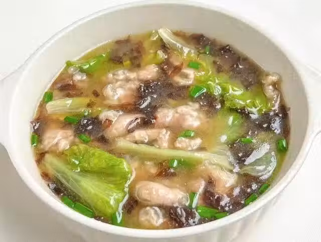 食材準備:紫菜,青菜,豬肉,姜,紅薯澱粉,鹽,雞精,生抽等。