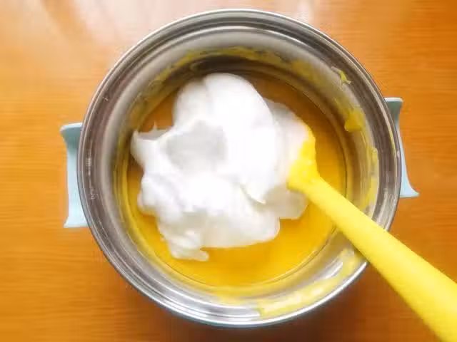 8、混合好後,在整個倒入剩餘的蛋白霜盆子內,繼續用刮刀翻拌均勻,最後混合好的狀態是蓬鬆濃稠細膩的,如果你混合好的蛋糕糊體積明顯變少很多,並且表面有密集的小氣泡,那就是消泡了,消泡後的蛋糕糊是做不成功的,所以大家混合蛋糕糊的時候,手法一定要正確,另外動作也要快和輕柔,因為蛋糕糊室溫放久了也是會消泡的哦。